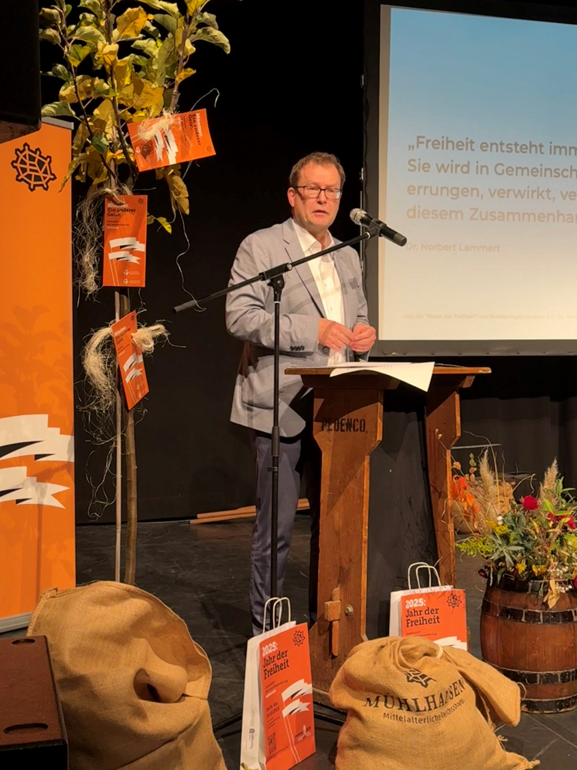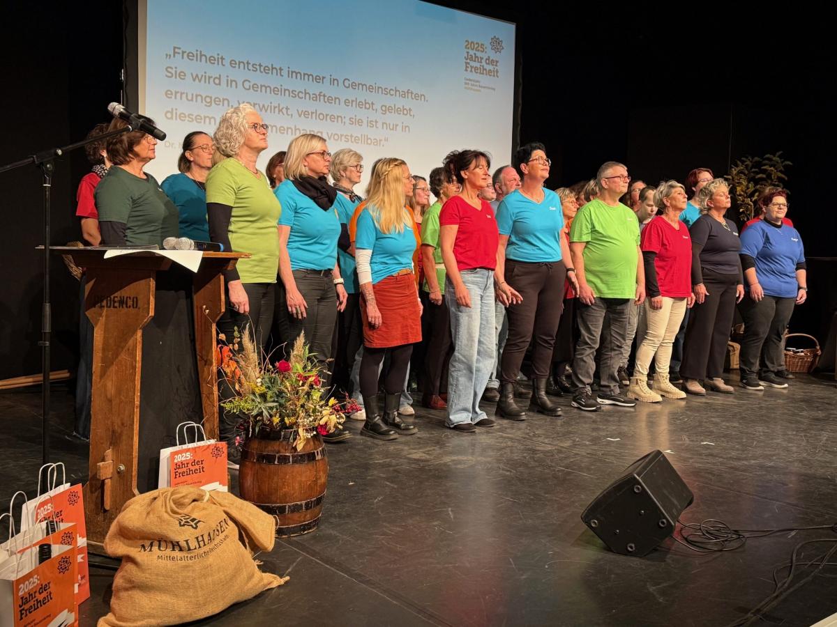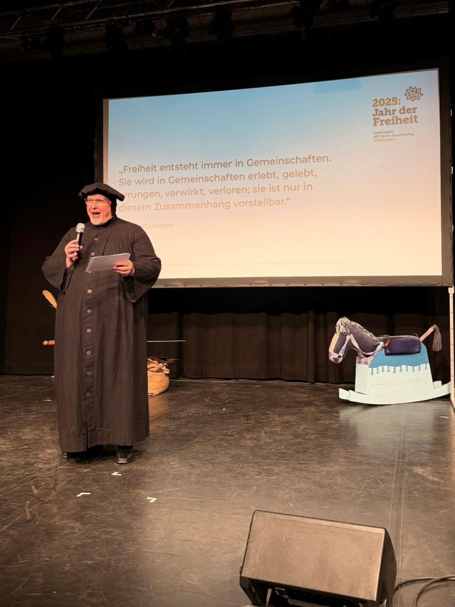 November 4, 2025 11:25 p.m.Am Dienstag, 4. November 2025 wurde das Themenjahr 2025 offiziell mit einer Dankesveranstaltung beim 3K in der Kilianikirche abgeschlossen. Ca. 75 Akteurinnen und Akteure waren der Einladung des Oberbürgermeisters und des städtischen Projektteams “500 Jahre Bauernkrieg” gefolgt. Die Partner, Sponsoren und Gäste aus Vereinen, Kirchen, Schulen, Gastronomie, Stadtrat und unterstützenden Firmen wurden durch den Mühlhäuser Popchor und Thomas Müntzer, alias Frank Möller, auf der Bühne gleich zu Beginn auf das Jahres- und Abendthema “Freiheit” eingestimmt.