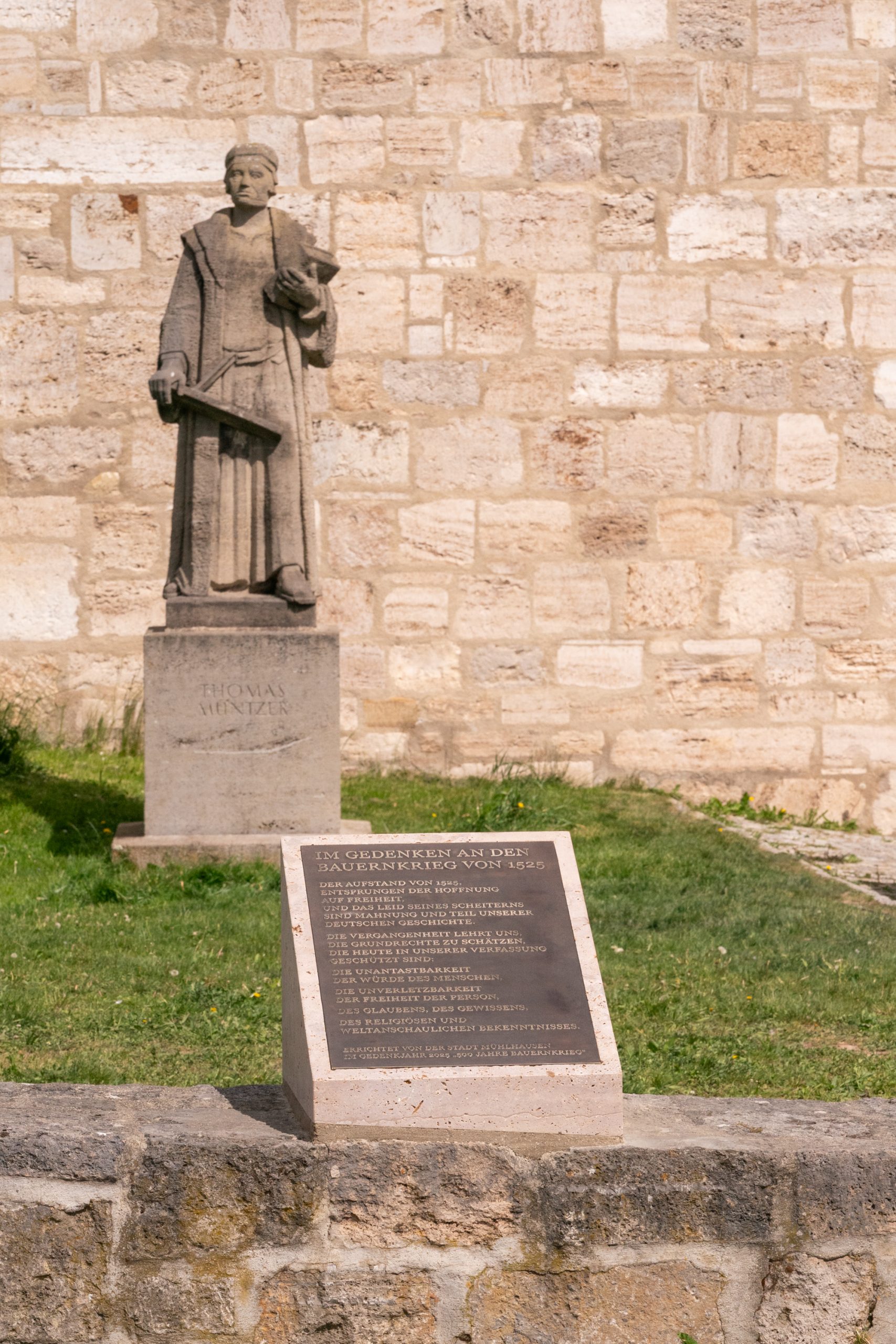 Mai 15, 2025 5:25 p.m.Am Donnerstag, den 15. Mai 2025 wurde die neue Gedenktafel in Erinnerung an das Gedenkjahr “500 Jahre Bauernkrieg” in würdigem Rahmen auf dem Kleinen Blobach enthüllt. Die Bronzetafel findet eingebettet in einen Kissenstein aus hellem Travertin ihren Platz auf der Zwingermauer mit Blick auf die historische Stadtmauer und das Thomas-Müntzer-Denkmal direkt am Inneren Frauentor. Rund 50 Interessierte waren gekommen, um der feierlichen Enthüllung durch Oberbürgermeister Herrn Dr. Johannes Bruns und die 2. Beigeordnete Frau Ann-Kristin Zabel-Fröhlich beizuwohnen. Zuvor fand der Stadtarchivar Herr Dr. Helge Wittmann angemessene Worte, um an die verheerende Bauernkriegsschlacht bei Frankenhausen genau vor 500 Jahren und ihrem Kampf um mehr Freiheit zu gedenken. Die Schlacht des Deutschen Bauernkrieges genau am 15.05.1525 und die Verfolgung im Nachgang hatte zahlreiche Mühlhäuser Bauern und Bürger ihr Leben gekostet.