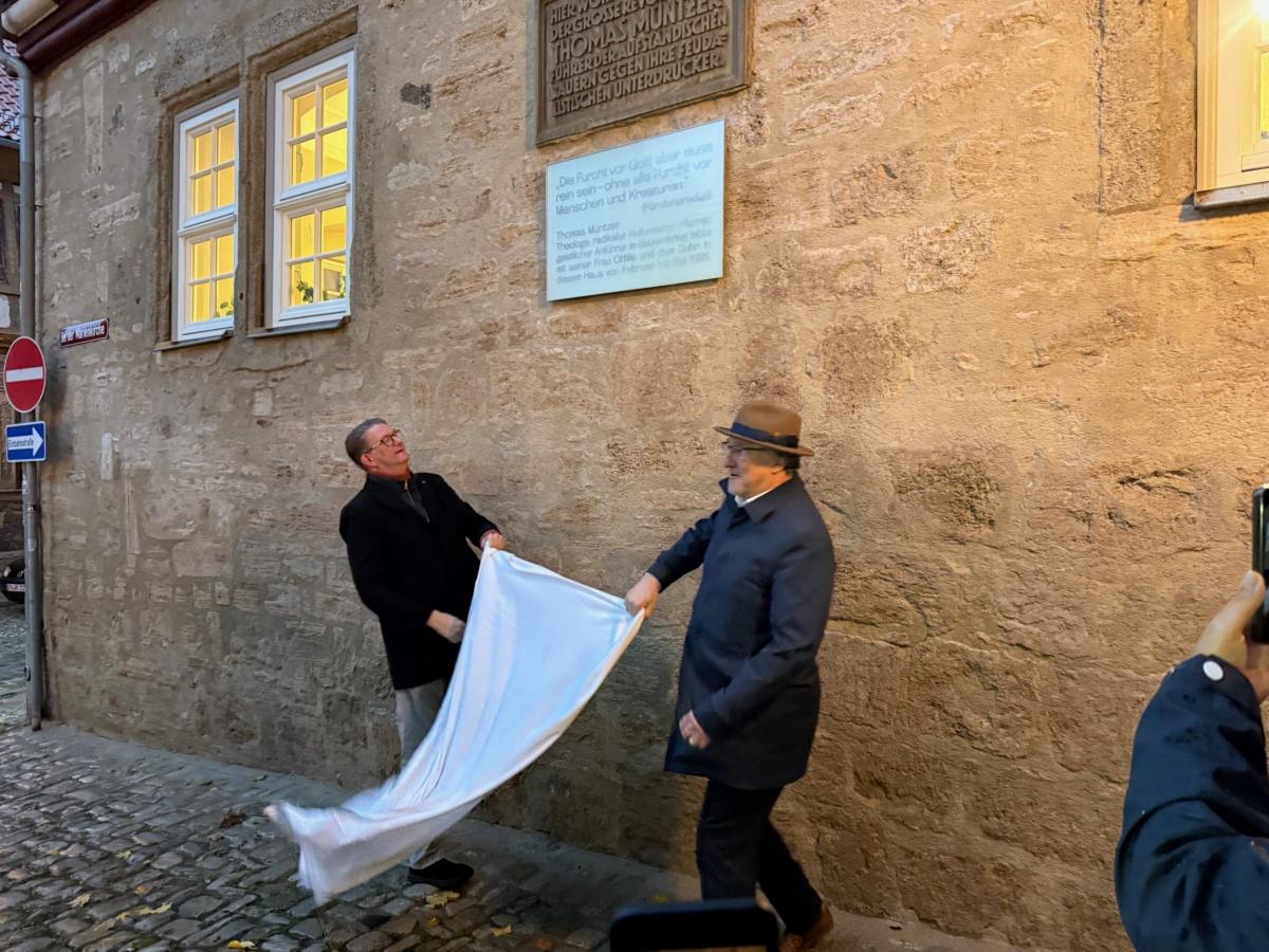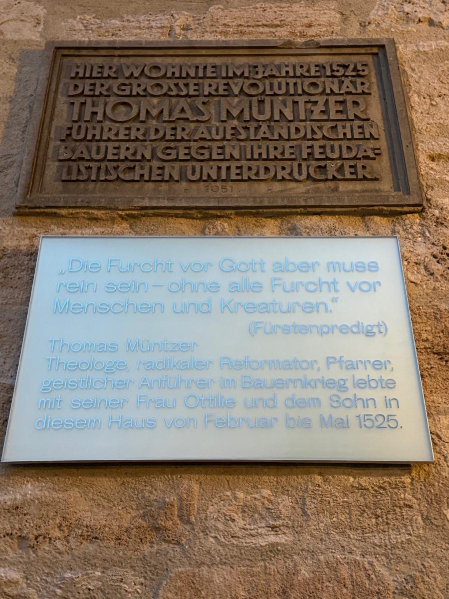 Oktober 29, 2025 6:52 p.m.Am 29.10.2025 wurde die neue Gedenktafel an dem ehemaligen Wohnhaus Thomas Müntzers, der heutige Sitz der Superintendentur an der Marienkirche feierlich enthüllt. Bereits 1951 wurde hier eine Gedenktafel zur Erinnerung an den Reformator Müntzer eingelassen, diese Inschrift wurde nun durch eine weitere ergänzt.